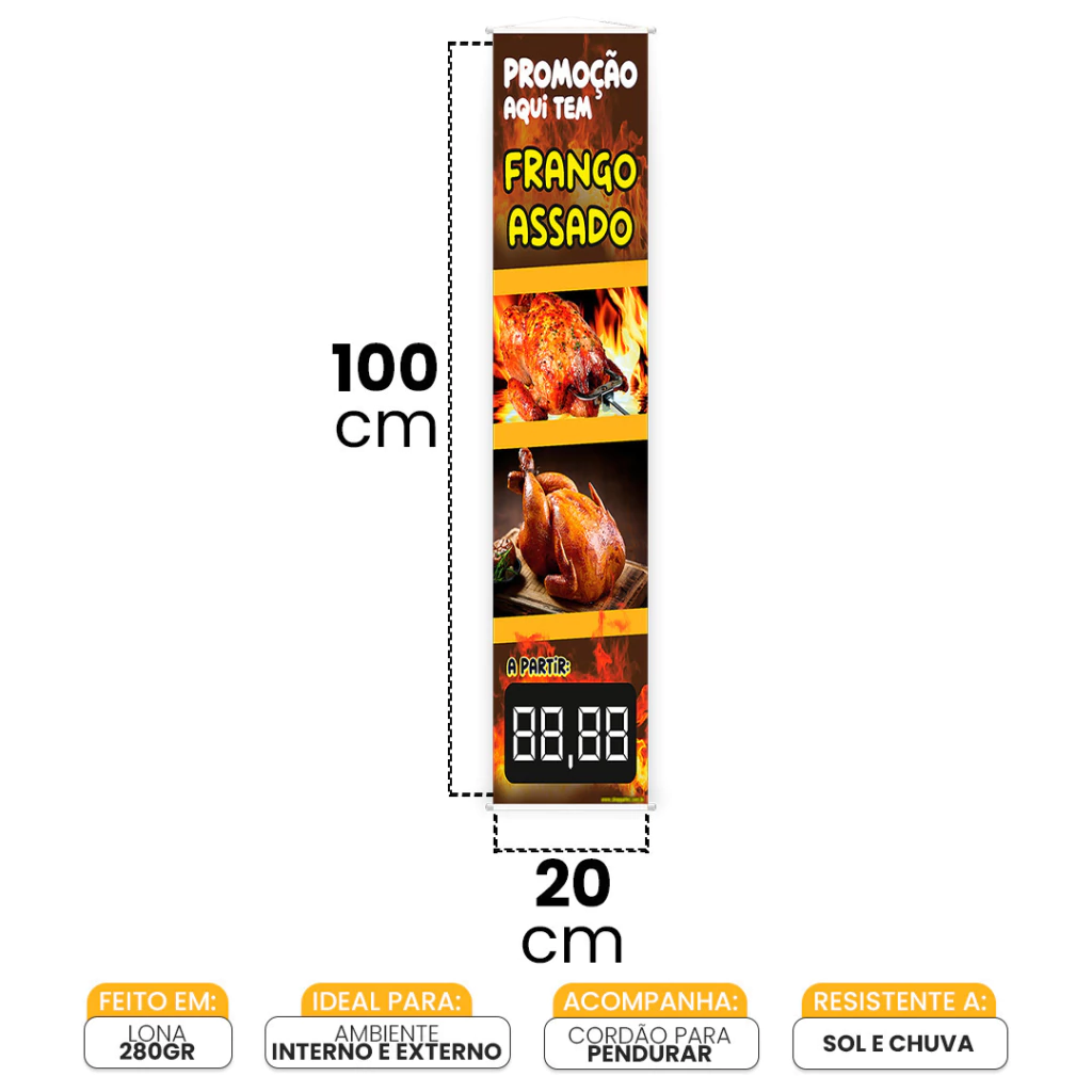 Porque ele une resistência, versatilidade e praticidade em um só produto. Pode ser usado tanto em ambientes internos quanto externos, aguenta bem sol, vento e rotina intensa sem perder a cor ou o charme. E a instalação? Zero dor de cabeça! Ele já vai prontinho, com bastão de madeira e cordinha, é só pendurar e deixar o banner fazer o marketing pesado.